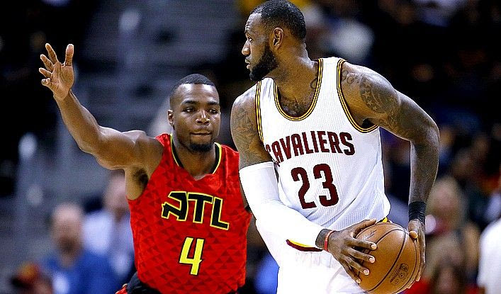 Cleveland Cavaliers forward LeBron James (23) is defended by Atlanta Hawks forward Paul Millsap (4) in the first half of an NBA basketball game on Sunday, April 9, 2017, in Atlanta. The Hawks won in overtime 126-125. (AP Photo/Todd Kirkland) AP