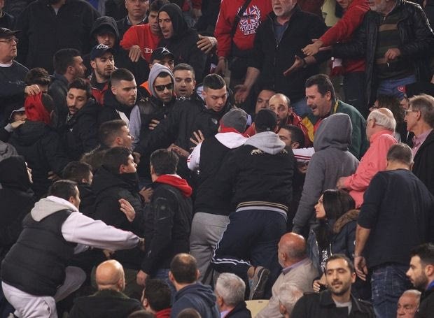 Παρόλα αυτά η ένταση στην κερκίδα, πάνω από τη φυσούνα, δεν έλειψε. Όπως μετέφεραν αυτόπτες μάρτυρες, αιτία υπήρξε ένα πανό, για το οποίο φίλοι του Ολυμπιακού τσακώθηκαν μεταξύ τους. Αρχικά υπήρξε λεκτική αντιπαράθεση, αλλά στη συνέχεια τα λόγια ανέβασαν τη… θερμοκρασία και υπήρξε ανταλλαγή χτυπημάτων. Μάλιστα χτυπήθηκε κι ένας μεσήλικας.