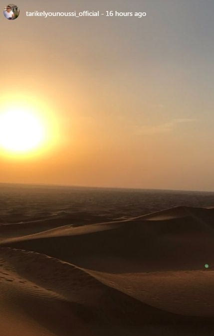 Στο Ντουμπάι βρίσκεται ο Ταρίκ Ελιονούσι, ο οποίος αφού πρώτα συνάντησε τον γνωστό σεφ, Νουσρέτ, τον οποίο είδαμε και πριν λίγες ημέρες στο Survivor, στη συνέχεια είπε να βγει μια βόλτα στην έρημο για εξερεύνηση. Ξέγνοιαστες στιγμές για τον άσο του Ολυμπιακού.