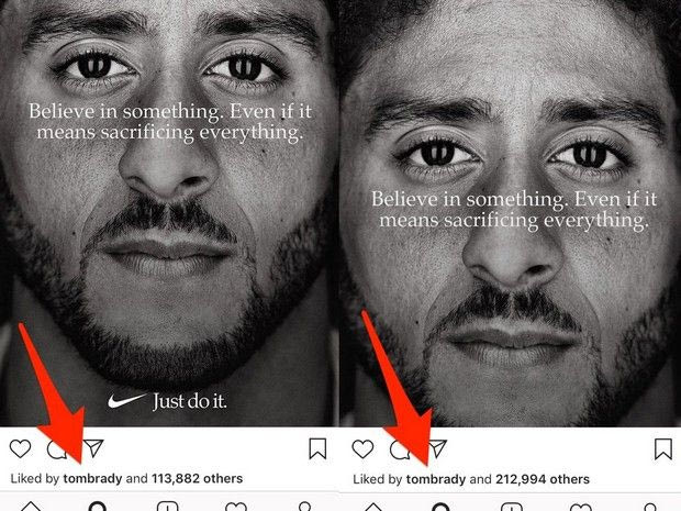 Την επομένη ο Μπρέιντι αποκάλυψε ότι είχε προτιμήσει να μείνει δίπλα στη μητέρα του, που είχε διαγνωστεί με καρκίνο. Μετά, έγινε αυτό, το like στην είδηση πως ο Κάπερνικ είναι ένα από τα πρόσωπα που επέλεξε η Nike για τα 30 χρόνια του Just do it.