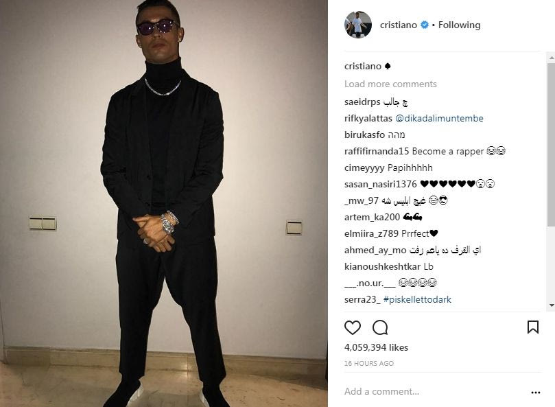 Γυαλί καθρέφτης. Καδένα, ασημένιο ρολόι και σκουλαρίκι. Ζιβάγκο και τίγκα στο μαύρο. Ο Κριστιάνο Ρονάλντο ντύθηκε... κλαρινογαμπρός και δικαίως ο λογαριασμός του στο Instagram γέμισε με σχόλια. Με ποιον διάσημο... φουσκωτό μοιάζει.