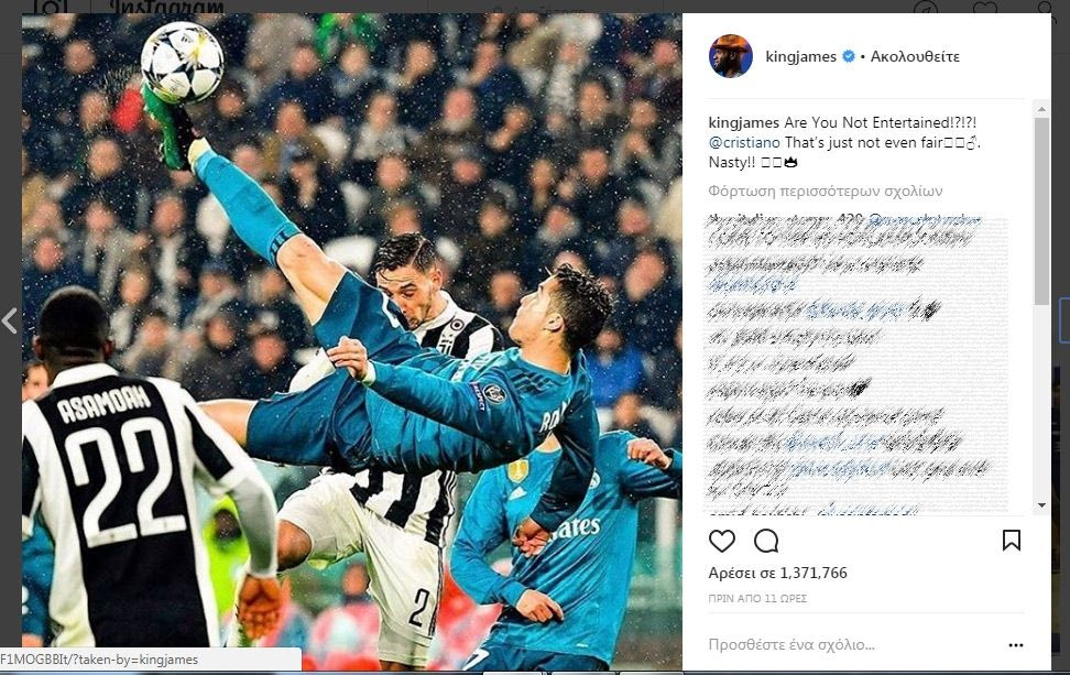 Την Μεγάλη Τρίτη ο Πορτογάλος τα έκανε όλα στην Ιταλία κόντρα στην Γιουβέντους. Πέτυχε δυο γκολ και έβγαλε μία ασίστ στο 3-0 της Ρεάλ κόντρα στην “Μεγάλη Κυρία”. Αρκετοί αθλητές έσπευσαν να αποθεώσουν τον CR7 στα social media και ένας από αυτούς ήταν και ο Λεμπρόν Τζέιμς.
