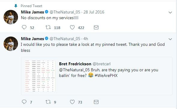 Ο Μάικ Τζέιμς πήγε με συμβόλαιο 45 ημερών στους Σανς, εξελίχθηκε σε... ηγετική μορφή, όμως αγωνίζεται... δωρεάν. Αυτό τουλάχιστον ισχυρίζεται κάποιος στο twitter, που κέρδισε την προσοχή του πρώην "πράσινου"! Τι απάντησε ο παίκτης.