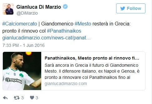Ο Ιταλός δημοσιογράφος Τζιανλούκα Ντι Μάρτζιο αποκάλυψε στο προσωπικό του blog του ότι ο Τζαντομένικο Μέστο θα συνεχίσει να φορά τη φανέλα του Παναθηναϊκού έως τον Ιούνιο του 2018.