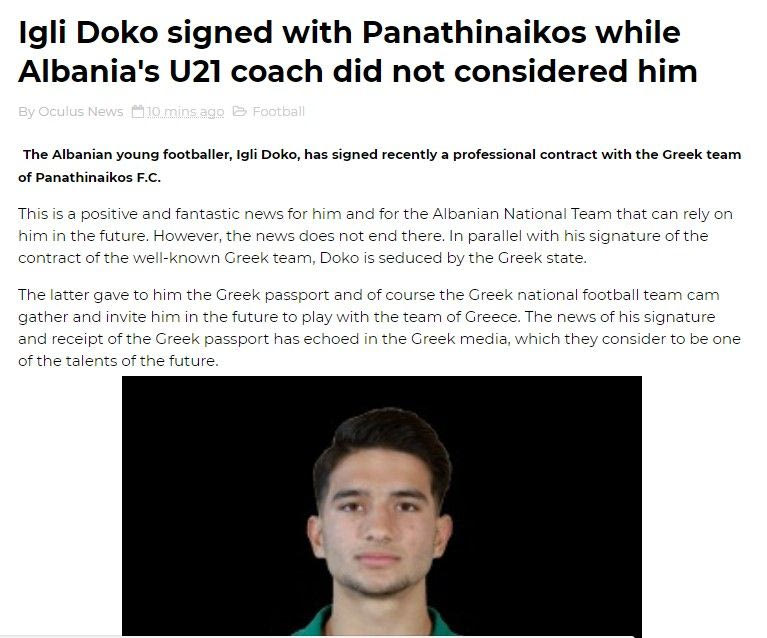 “Ο Ίγκλι Ντόκο υπέγραψε στον Παναθηναϊκό, τη στιγμή που ο προπονητής τηςU21 δεν τον έχει στα υπόψην του…», ανέφερε στον τίτλο της η ιστοσελίδα “ocnal.com” και πρόσθεσε στο κυρίως κείμενο. «Ο νεαρός Αλβανός ποδοσφαιριστής υπέγραψε πρόσφατα επαγγελματικό συμβόλαιο με τον Παναθηναϊκό της Ελλάδας. Αυτό σίγουρα είναι ένα πολύ θετικό, ένα φανταστικό νέο για τον ίδιο, αλλά και για την εθνική ομάδα της Αλβανίας, αφού μπορεί να στηριχθεί πάνω του για το μέλλον. Ωστόσο, τα νέα δεν σταματούν εδώ.