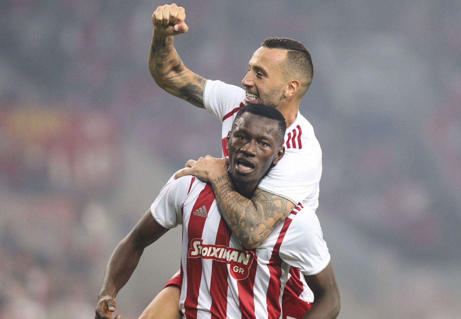 Ο Μαντί Καμαρά του Ολυμπιακού πανηγυρίζει μαζί με τον Ομάρ Ελαμπντελαουί το γκολ που σημείωσε κόντρα στην ΑΕΚ σε αναμέτρηση για τη Super League 1 2019-2020 στο 'Γεώργιος Καραϊσκάκης', Κυριακή 27 Οκτωβρίου 2019 ΜΑΡΚΟΣ ΧΟΥΖΟΥΡΗΣ / Eurokinissi Sports