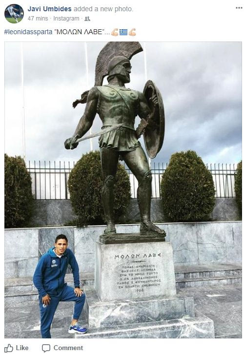 Πάντως ο Χαβιέρ Ούμπιδες δεν δίστασε να κάτσει πλάι στο άγαλμα του θρυλικού βασιλιά της Σπάρτης και να φωτογραφηθεί. Όσο για το λεκτικό που συνόδευσε τη φωτογραφία; “ΜΟΛΩΝ ΛΑΒΕ”.