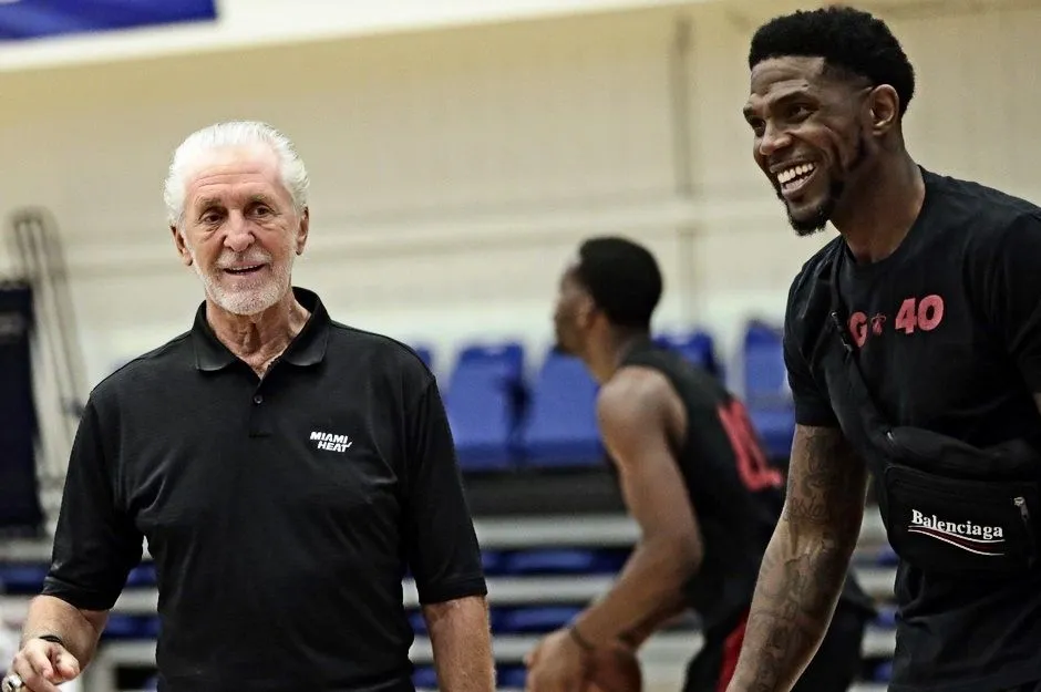O Oυντόνις Χάσλεμ με τον Πατ Ράιλι, στο training camp των Χιτ, το Σεπτέμβριο του 2018. AP Photo/Lynne Sladky