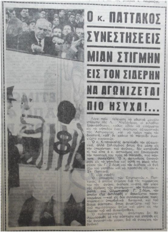 Ο αστυνομικός διέκοψε τον αγώνα και μετέφερε τον Γιώργο Σιδέρη κάτω από τα επίσημα της Λεωφόρου, όπου ο Παττακός φέρεται να του είπε: “παίξει πιο ήρεμα”. Το παιχνίδι ολοκληρώθηκε με τους “πράσινους” να κερδίζουν 1-0.