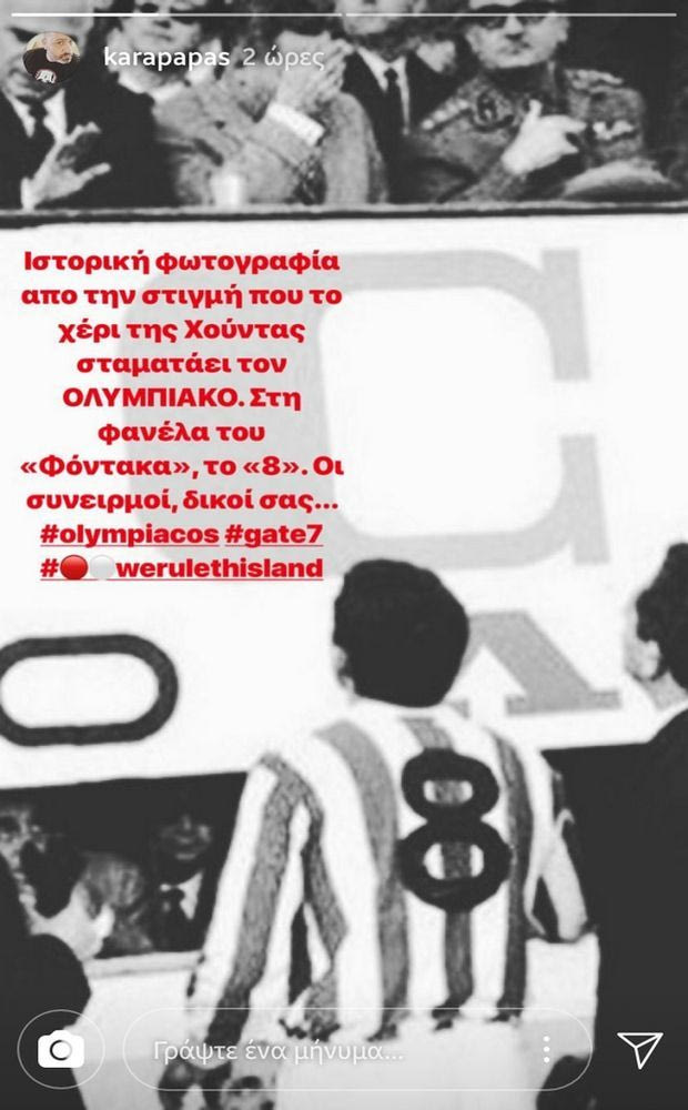 “Ιστορική φωτογραφία από την στιγμή που το χέρι της χούντας σταματάει τον Ολυμπιακό. Στην φανέλα του “Φόντακα”, το “8”. Οι συνειρμοί δικοί σας”, έγραψε και αναφερόταν στο ντέρμπι με τον Παναθηναϊκό στη Λεωφόρο στις 22/11/1967, με τους Γιώργο Σιδέρη ( ο “Φόντακας”) και τον (αντιπρόεδρο της κυβέρνησης Παπαδόπουλο) Στυλιανό Παττακό να… πρωταγωνιστούν στο ενσταντανέ.
