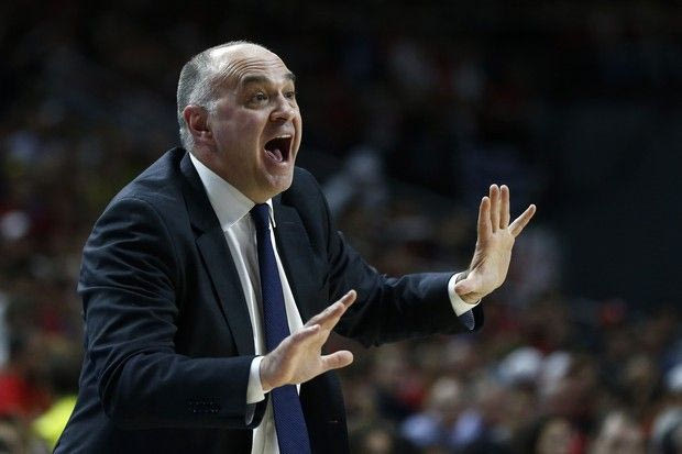 Real coach Pablo Laso gives instructions to his players during the Euroleague Final Four Championship basketball match between Real Madrid and Olympiacos in Madrid, Spain, Sunday, May 17, 2015. (AP Photo/Daniel Ochoa de Olza) AP