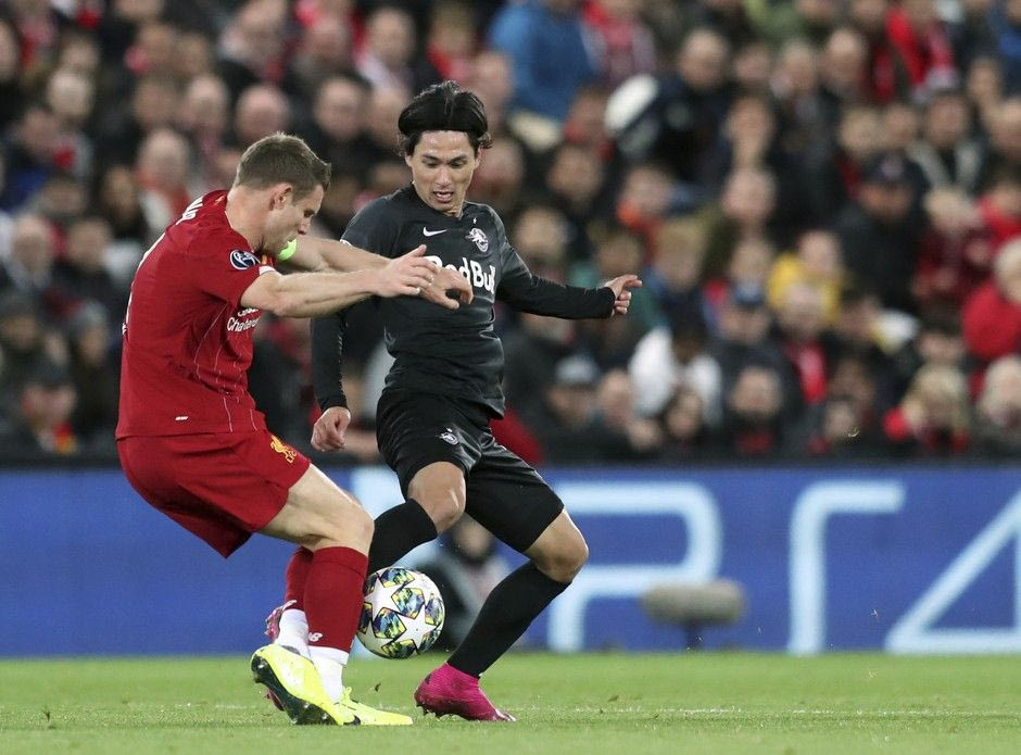 Ο Τάκουμι Μιναμίνο κάνει δύσκολη τη ζωή του Τζέιμς Μίλνερ, στις 2/10 του 2019, στο Anfield. AP Photo/Jon Super