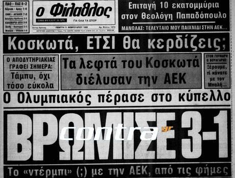 Είναι επειδή το συγκεκριμένο παιχνίδι, ο συγκεκριμένος τελικός, ξέφυγε από τα στενά ποδοσφαιρικά πλαίσια, έγινε πεδίο επιχειρηματικών και πολιτικών μαχών και σηματοδότησε μια αδυσώπητη μάχη που αν δεν ξεσπούσε το σκάνδαλο Κοσκωτά, θα είχε αλλάξει την ιστορία του ελληνικού ποδοσφαίρου με τον Ολυμπιακό ουσιαστικά να «διαλύει» τον Παναθηναϊκό παίρνοντας το μεγαλύτερό του αστέρι, το Δημήτρη Σαραβάκο.