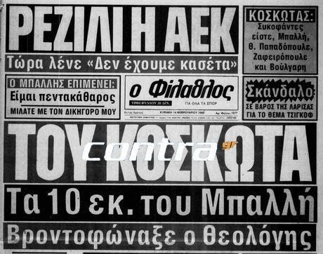 Οι μέρες πριν τον τελικό θυμίζουν βιομηχανικό πόλεμο, ελάχιστοι ασχολούνται με τη μπάλα και όλο το ενδιαφέρον είναι στραμμένο στη μετωπική σύγκρουση των δύο κολοσσών: Βαρδινογιάννης Vs Κοσκωτάς – καθεστηκυεία Vs ανερχόμενη τάξη πραγμάτων. Σε αυτον τον τελικό έχει επενδυθεί κάτι παραπάνω από μια απλή επιθυμία επικράτησης. Παίζεται γόητρο, λεφτά, φιλοδοξίες, πολιτική, επενδύσεις και όχι απλώς «ποδόσφαιρο». Οι φημολογίες για δωροδοκίες δίνουν και παίρνουν, στα καφενεία όλοι «άκουσαν», «τους είπαν», «έμαθαν» ότι ο Κοσκωτάς έδωσε 20-30-70-150 εκατομμύρια στον τάδε παίκτη, ότι ο Βαρδινογιάννης «τελείωσε, είναι στα σχοινιά και αποχωρεί από τον Παναθηναϊκό». Ο Τύπος βρίσκεται σε παροξυσμό, έχουν ξεχαστεί ο Τζίγκοφ, ο Θεολόγης, τα καμμένα λάστιχα και τα τρακτέρ στην εθνική οδό και στα πρωτοσέλιδα ακόμα και των πολιτικών εφημερίδων (μη λησμονούμε ότι ο Κοσκωτάς ήλεγχε και σημαντική μερίδα του Τύπου με τη «Γραμμή») χορεύουν δισεκατομμύρια.