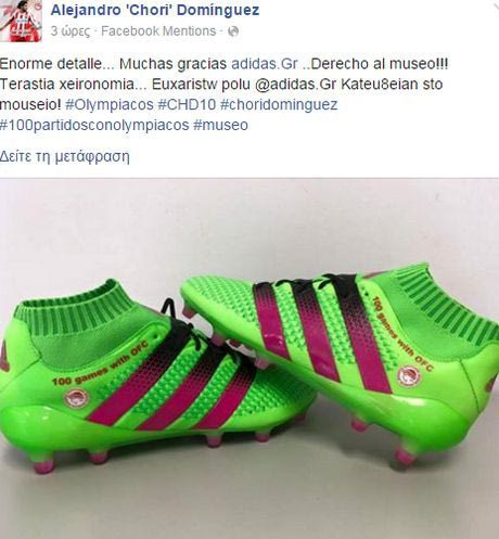 Με αφορμή τις 100 εμφανίσεις του Τσόρι Ντομίνγκες με τη φανέλα του Ολυμπιακού, η Adidas έκανε δώρο στον Αργεντινό ένα επετειακό ζευγάρι παπούτσια χρώματος... πράσινου.