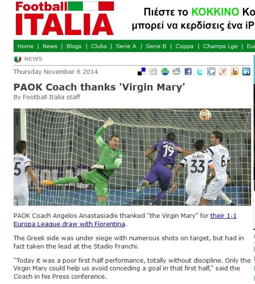 Συγκεκριμένα ο τίτλος στο ρεπορτάζ της ιστοσελίδας “football-italia” αναφέρεται στην τοποθέτηση του Έλληνα τεχνικού μετά το τέλος της αναμέτρησης, ο οποίος υποστήριξε ότι “με τη βοήθεια της Παναγίας ο ΠΑΟΚ δεν δέχτηκε γκολ από τη Φιορεντίνα”.