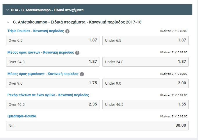 Ο Stoiximan.gr έχει ειδική κατηγορία με μικρά-μικρά στοιχήματα για τον Γιάννη Αντετοκούνμπο για: