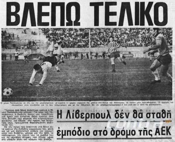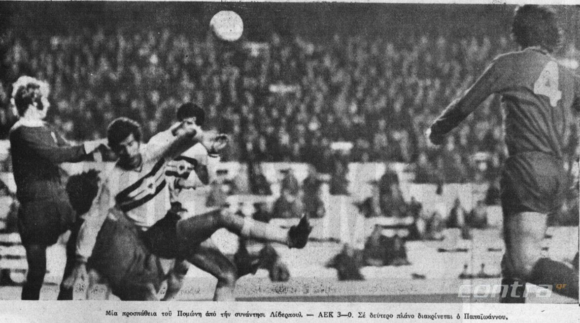 Οι Έλληνες δεν σταματούν να επιτίθενται, τη στιγμή που οι αστέρες της Λίβερπουλ είναι αιφνιδιασμένοι από την αλλαγή στην απόδοση των αντιπάλων τους. Δεν περνούν έξι λεπτά και ο Μίμης Παπαϊωάννου στέλνει με κεφαλιά τη μπάλα στο κάθετο δοκάρι του Κλέμενς και στην επαναφορά ο Πομώνης αντί να τροφοδοτήσει τον αμαρκάριστο Νικολαΐδη που είναι με πρόσωπο στο τέρμα, προτιμά να σουτάρει δυνατά από πολύ διαγώνια θέση. Η μπάλα καταλήγει πολλά μέτρα άουτ και μαζί με αυτή την απίστευτη διπλή ευκαιρία, ολοκληρώνεται και η κυριαρχία της ΑΕΚ στον αγωνιστικό χώρο.