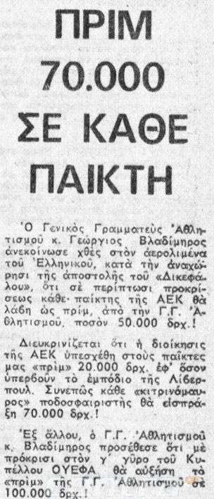 Ανήμερα της αναχώρησης στο αεροδρόμιο, ο ΓΓΑ Βλαδίμηρος ανακοινώνει ότι το πριμ από τη Γενική Γραμματεία θα αυξηθεί στις 100 χιλιάδες δραχμές σε περίπτωση πρόκρισης και η ΑΕΚ αναχωρεί για την Αγγλία με ακόμη ένα επιπλέον κίνητρο εκτός από την αισιοδοξία που καλλιεργήθηκε από την ημέρα της κλήρωσης. Στο ίδιο αεροπλάνο με την Ένωση και η αποστολή του Ολυμπιακού, που μια ημέρα αργότερα από τη μάχη στο Λίβερπουλ, καλείτο να αντιμετωπίσει τους Πετεινούς της Τότεναμ στο White hart Lane του Λονδίνου. Η διαφορά στην αμετροέπεια είναι τεράστια, αφού ο Ολυμπιακός έχει ξεκινήσει πολύ δυνατά το Πρωτάθλημα και έχει στραβοπατήσει μόνο μια φορά (ήττα στην Τούμπα) και η διοίκησή του δεν έχει ανάγκη την ευρωπαϊκή διάκριση για να σώσει επικοινωνιακά τόσο νωρίς τη σεζόν.