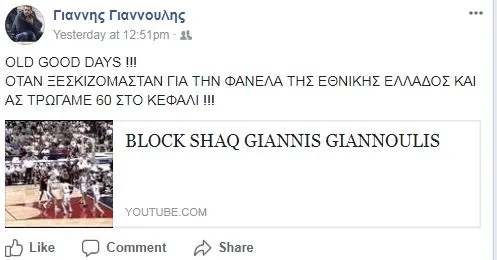 Έκανε μπλοκ στον τεράστιο Σακίλ Ο’Νιλ, μια φάση οποία τον… σημάδεψε. Την Τρίτη (14/11) το θυμήθηκε και πόσταρε τη φάση στo facebook γράφοντας ” Παλιές καλές εποχές. Όταν ξεσκιζόμασταν με τη φανέλα της Εθνικής Ελλάδας και ας τρώγαμε 60 στο κεφάλι”.