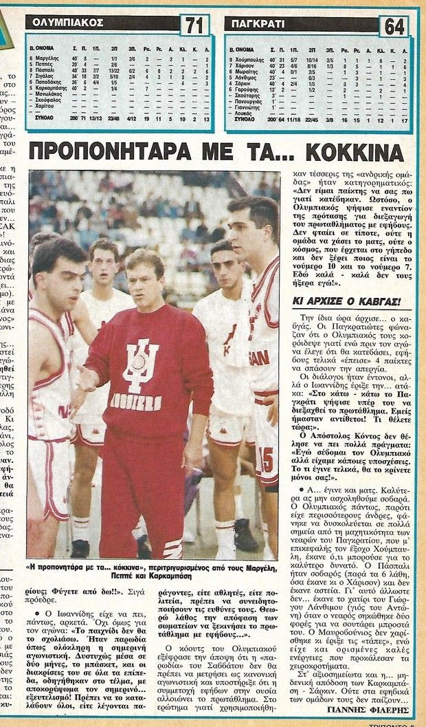 Η περίπτωση Ολυμπιακού ήταν ιδιαίτερη. Οι «ερυθρόλευκοι» στο νέο ξεκίνημά τους, είχαν αρχίσει το πρωτάθλημα με θρίαμβο επί του Άρη και μετρούσαν ένα 3-1 μέχρι να υποδεχθούν το Παγκράτι. Εντάξει, θα είχαν τον Ζάρκο Πάσπαλι στην σύνθεσή τους (οι ξένοι έπαιζαν κανονικά) αλλά η εφηβική τους ομάδα δεν ήταν τόσο δυνατή. Αυτή εμφανίστηκε αρχικά στο παρκέ του ΣΕΦ, έχοντας για έξτρα ενίσχυση, εκτός του Πάσπαλι και τον ομογενή Λου (Ηλία) Καρκαμπάση. Παρεμπιπτόντως ο προερχόμενος από τον Καναδά σέντερ, είναι πλέον ένας διακεκριμένος οινοχόος (σομελιέ) και ιδιοκτήτης τρατορίας ονόματι Pane Vino!