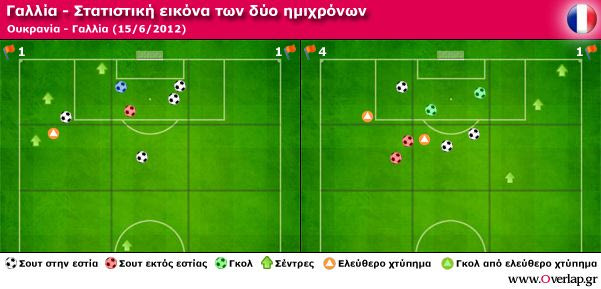 Ο κόουτς των Ουκρανών γνώριζε το δυνατό σημείο και τα βασικά χαρακτηριστικά του παιχνιδιού της Γαλλίας. Έχοντας κατά νου τον έλεγχο του ρυθμού που επιβάλλουν οι Γάλλοι με χαρακτηριστικά μειωμένο τέμπο, αλλά και τις “συνήθειες” των χαφ να τροφοδοτούν τον Ριμπερί ώστε να πάρει αυτός τις περισσότερες ατομικές προσπάθειες, προσάρμοσε το δεξί άκρο της άμυνάς του επάνω στον Γάλλο και τις βοήθειες που του παρείχαν οι συμπαίκτες του. Αποτέλεσμα ήταν η μειωμένη –ουσιώδης- τροφοδότηση του σταρ της Μπάγερν για 45 λεπτά. Επιπλέον, ο Μπλαχίν στο πρώτο ημίχρονο: