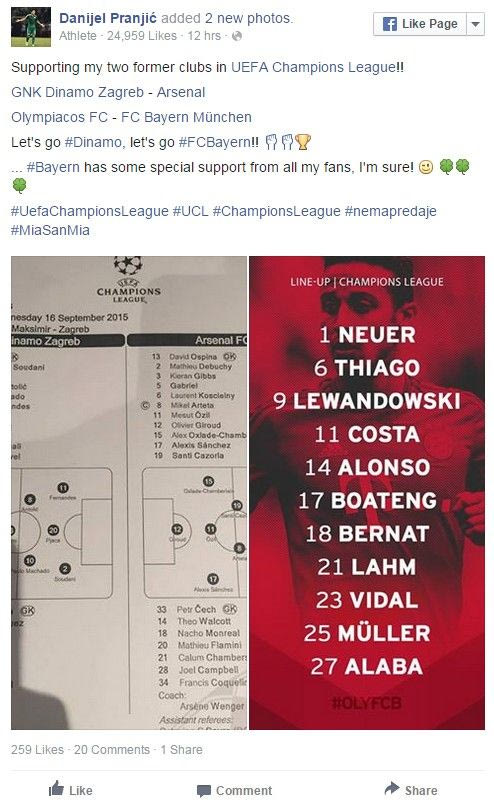 Ο Κροάτης αμυντικός του Παναθηναϊκού, μάλιστα πριν την έναρξη των δύο αγώνων, ανέβασε στη σελίδα του στο facebook ένα μήνυμα στήριξης προς τις αντιπάλους του Ολυμπιακού και της Άρσεναλ.