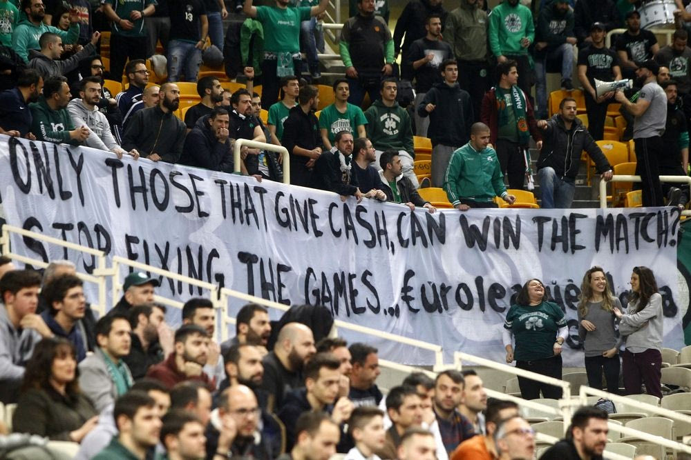 Οι φίλοι του Παναθηναϊκού ύψωσαν πανό στο ΟΑΚΑ πριν το τζάμπολ του αγώνα με την Ζαλγκίρις, με σκληρό μήνυμα κατά της διοργανώτριας αρχής της Euroleague (φωτογραφία).