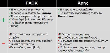 Από την άλλη ο Άρης κρατά την πολύ καλή εμφάνιση του Αγκάνθο και την γενικότερη βελτιωμένη επιθετική λειτουργία, όμως η αμυντική λειτουργία αλλά και μεμονωμένα κρούσματα έλλειψης τακτικής/αγωνιστικής παιδείας (η…φλυαρία του Γιαννιώτα, το «χαλάρο» σπριντ των Πουλίδο, Κοέλιο, η άμυνα του Καζναφέρη στο γκολ του Φωτάκη) υπενθυμίζουν τα σημαντικά – έως τώρα – αγωνιστικά προβλήματα.