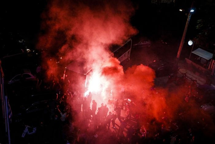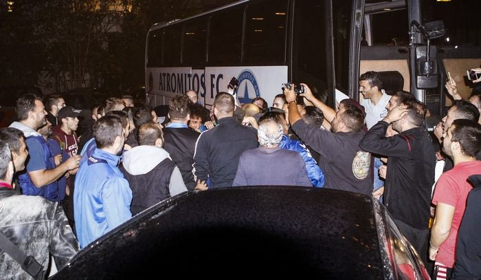Περίπου 300 φίλοι του Ατρομήτου υποδέχθηκαν τους παίκτες και τον προπονητή της ομάδας τους με καπνογόνα και συνθήματα μετά τη μεγάλη νίκη κόντρα στην ΑΕΚ.