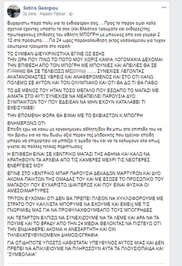 Χτυπήματα στο κεφάλι από τον Γιώργο Μπόγρη, χωρίς να έχει προηγηθεί κάποια μεταξύ τους λεκτική αντιπαράθεση ή οποιαδήποτε αφορμή, δέχθηκε ο δημοσιογράφος Σωτήρης Γεωργίου από τον σέντερ του Ολυμπιακού Γιώργο Μπόγρη, σε μπαρ του Κολωνακίου.