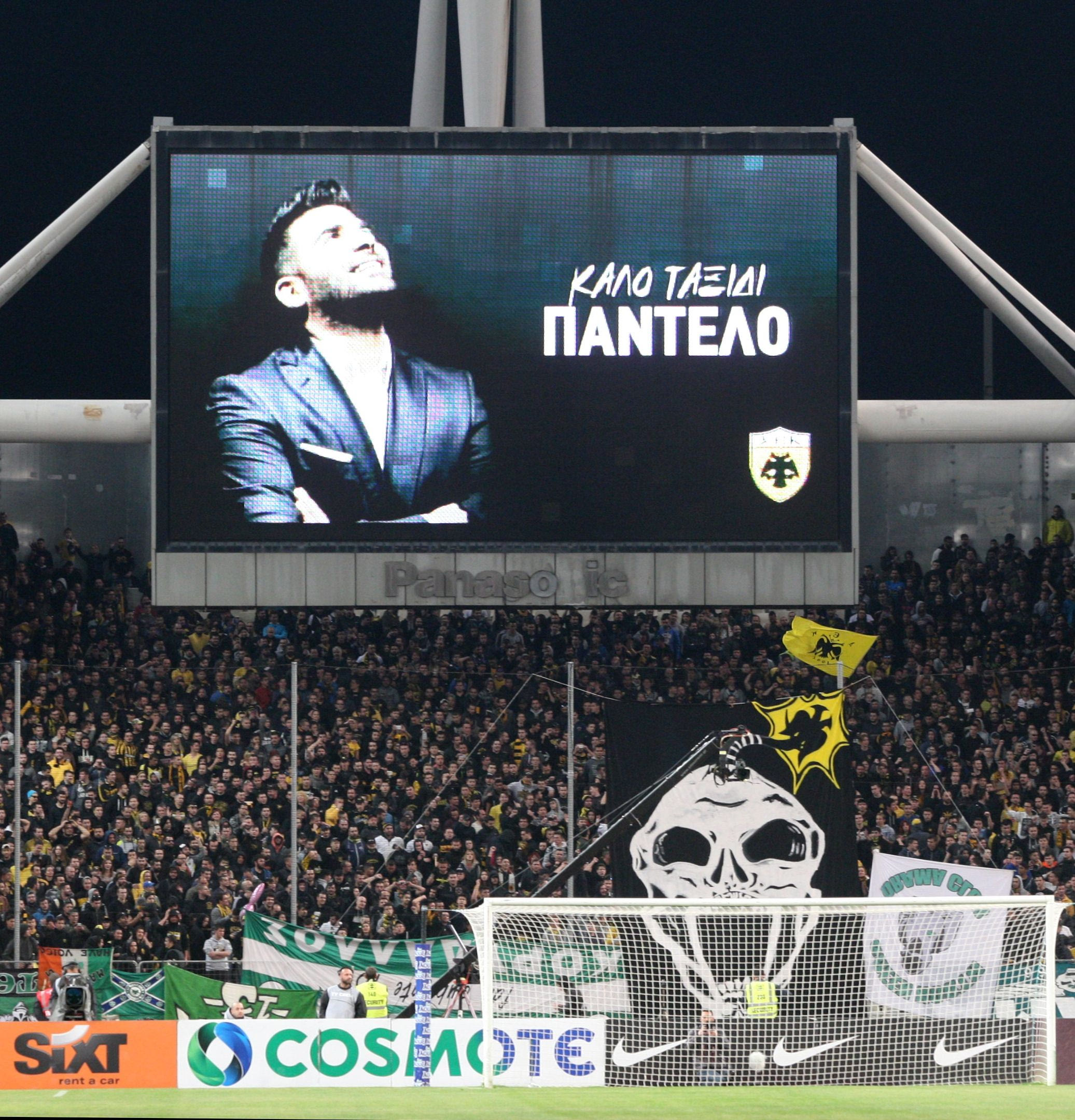 Έτσι πριν τη σέντρα του αγώνα στα μάτριξ του γηπέδου εμφανίστηκε μια φωτογραφία του τραγουδιστή που έγραφε “ΚΑΛΟ ΤΑΞΙΔΙ ΠΑΝΤΕΛΟ”, ενώ από τα μεγάφωνα του γηπέδου ακούστηκε η γνωστή επιτυχία του “Γίνεται”.