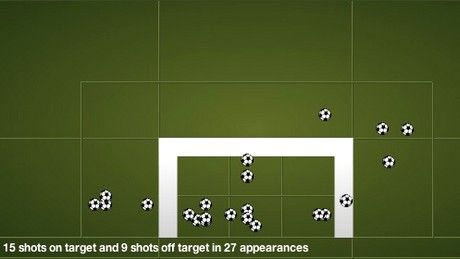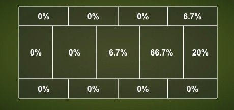 Έτσι, τα οκτώ γκολ δεν εντυπωσιάζουν, όμως είναι πάρα πολύ υψηλό το 63% στα σουτ on target και δείγμα μεγάλης ευστοχίας το γεγονός πως ο Σαβιόλα σκόραρε στο 33.3% των προσπαθειών του. Όλα τα γκολ μπήκαν με το δεξί και στο επόμενο γράφημα φαίνεται πως όλα, πλην ενός, ήταν προσπάθειες μέσα στην μεγάλη περιοχή, με αγαπημένο χώρο εκτέλεσης το ύψος του πέναλτι.