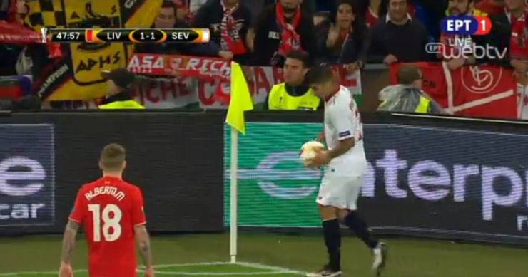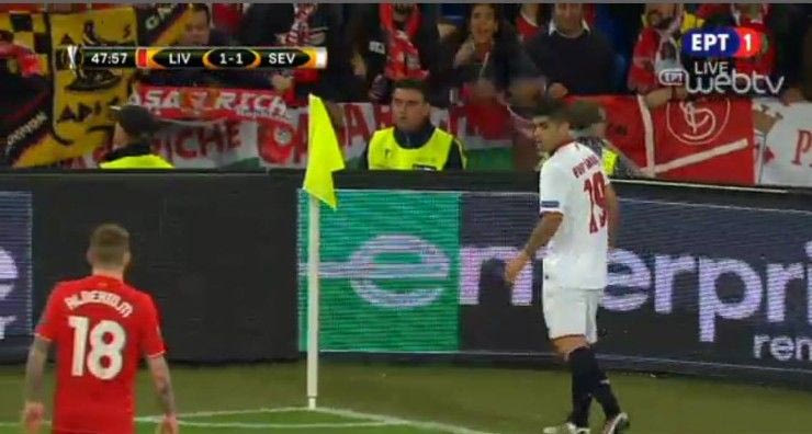 Κατά τη διάρκεια του δευτέρου ημιχρόνου στην αναμέτρηση μεταξύ της Σεβίλλης και της Λίβερπουλ, ο τηλεοπτικός φακός “συνέλαβε” έναν φίλο του Άρη να βρίσκεται στις εξέδρες των Σεβιγιανων με μία σημαία των “κιτρίνων”.