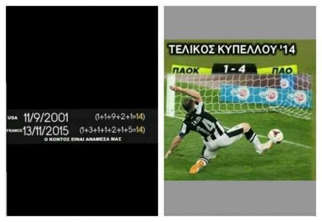 Όπως θα δείτε και στη φωτογραφία, το άθροισμα των ημερομηνιών των τρομοκρατικών χτυπημάτων σε Δίδυμους Πύργους και Παρίσι μας δίνει ως αποτέλεσμα το “14”, το οποίο ήταν το νούμερο που φορούσε ο Σαλπιγγίδης στον “Δικέφαλο”, αλλά και στην Εθνική Ελλάδας.