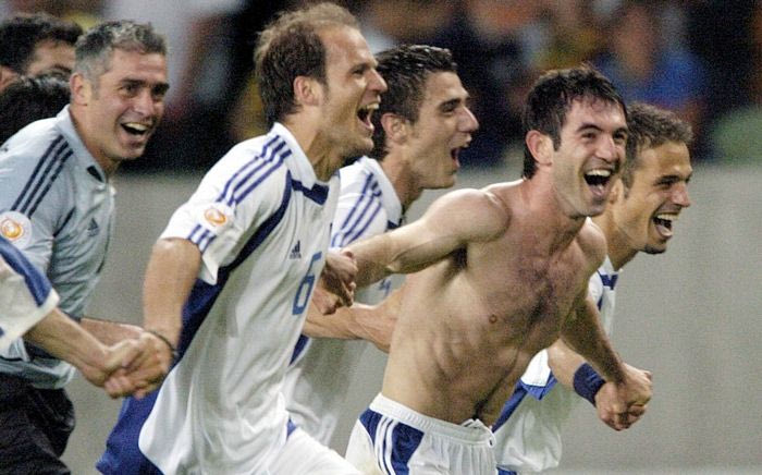 epa000220254 Greek players celebrate after winning the EURO 2004 quarter final match between France and Greece at the stadium Jose de Alvalade in Lisbon on Friday, 25 June 2004. Greece won 1-0. EPA/BERND WEISSBROD NO MOBILE PHONE APPLICATIONS EPA