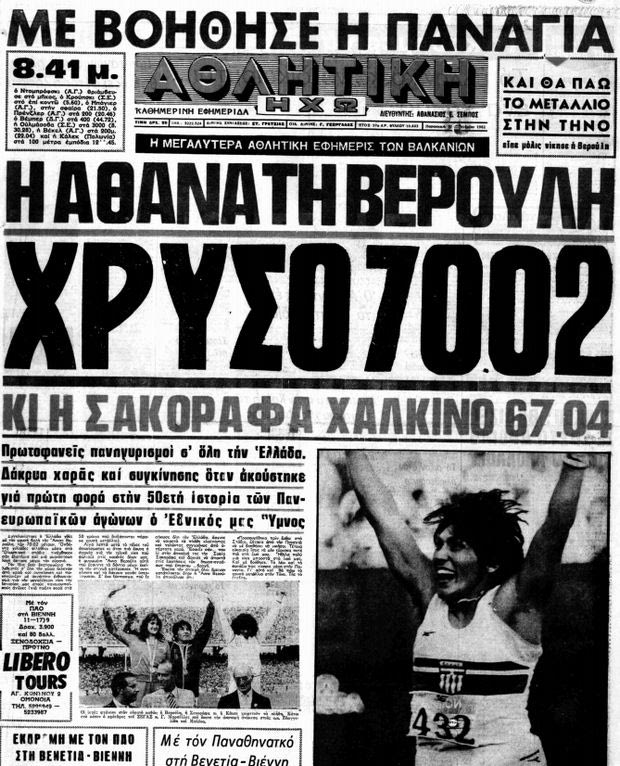 Μπορεί κανείς εύκολα να φανταστεί την σημασία της κατάκτησης, όχι ενός αλλά δυο μεταλλίων εκ των οποίων, μάλιστα, το ένα χρυσό! Το σπουδαίο δίδυμο Βερούλη-Σακοράφα ανέβηκε στο βάθρο στις 9 Σεπτεμβρίου, σε μια χρονιά όπου η μία έσπρωχνε την άλλη για να ξεπεράσουν τον εαυτό τους. Ο ανταγωνισμός ήταν έντονος, όπως συνήθως συμβαίνει στις περιπτώσεις που δυο μεγάλοι αθλητές μονομαχούν στο ίδιο αγώνισμα. “Ήταν οι δυο πρώτες και πολύ μεγάλες σταρ που είχαμε” σχολιάζει ο Γιάννης Θεοδωρακόπουλος, πρόεδρος του ΠΣΑΤ και κορυφαίος συντάκτης στίβου, βέβαια, στον έντυπο και ηλεκτρονικό Τύπου.