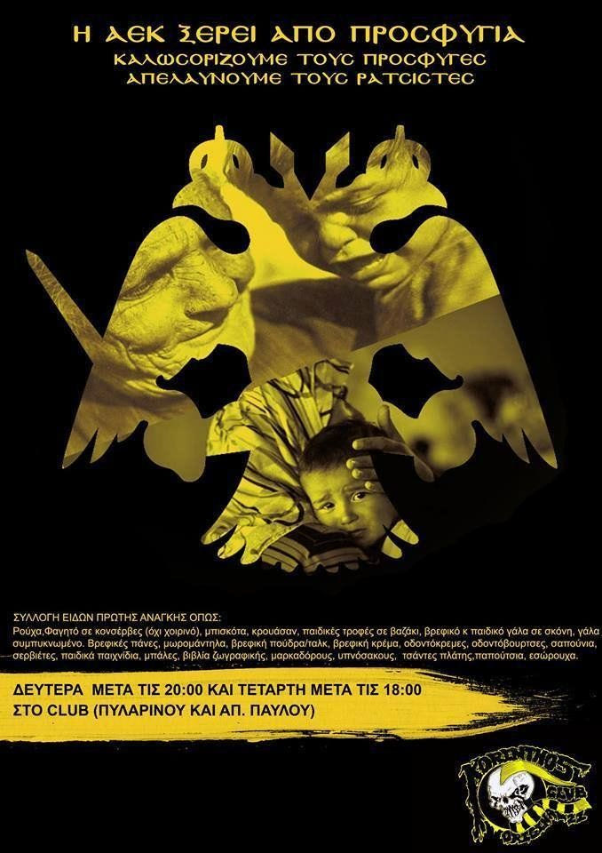 Με σύνθημα: Η ΑΕΚ ξέρει από προσφυγιά, καλωσορίζουμε τους πρόσφυγες, απελαύνουμε τους ρατσιστές, συγκεντρώνει τρόφιμα και είδη πρώτης ανάγκης για τους πρόσφυγες.