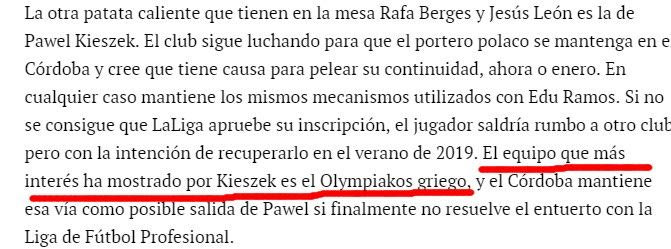 Ο 34χρονος Κίεζεκ έπαιζε την τελευταία 2ετία στην Κόρδοβα (β’ κατηγορία) έχοντας το ρόλο του βασικού (79 ματς). Η ισπανική ομάδα κάνει προσπάθεια να τον κρατήσει, αλλά σύμφωνα με τις ισπανικές πηγές πέφτει πάνω στο ενδιαφέρον του Ολυμπιακού. Με αποτέλεσμα ο Κίεζεκ να “τρενάρει την απόφασή του περιμένοντας ειδοποίηση από Πειραιά.