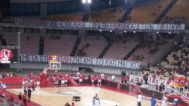 Την (άδεια) κερκίδα των οργανωμένων στο ΣΕΦ κοσμούσαν δύο μεγάλα σε μήκος πανό που συνδύαζαν το όνομα του Ντούσαν Ίβκοβιτς με τις δύο (από τις τρεις) κορυφαίες στιγμές στην ιστορία του μπασκετικού τμήματος: τις κούπες σε Ρώμη (1997) και Κωνσταντινούπολη (2012).