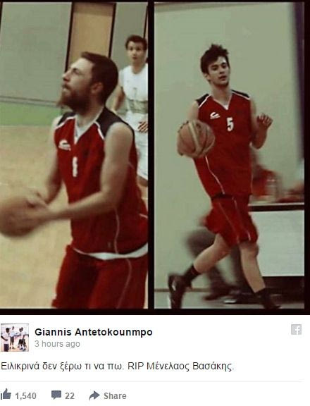 Η είδηση του θανάτου του 23χρονου Μενέλαου Βασάκη, που αγωνιζόταν στην Ολυμπιάδα Παπάγου, από τροχαίο, ξάφνιασε ακόμη τον Γιάννη Αντεοτοκούνμπο που μετά το ματς που είχε με τους Μπακς κόντρα στους Μπουλς, έστειλε τα δικά του συλλυπητήρια μέσω facebook.