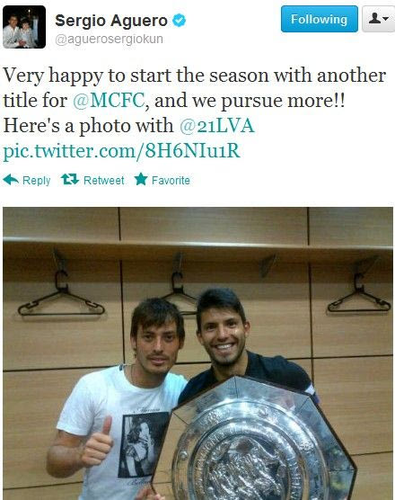 “Είμαι πολύ χαρούμενος που η σεζόν ξεκίνησε με ακόμη έναν τίτλο για τη Μάντσεστερ Σίτι, θέλουμε να σημειώσουμε κι άλλες διακρίσεις!!”, ήταν το μήνυμα του Αργεντινού επιθετικού, ο οποίος το συνδύασε με μία πανηγυρική φωτογραφία (στο πλάι του ο Νταβίδ Σίλβα).