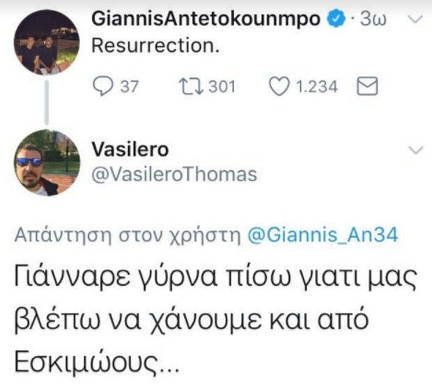 Το σαββατιάτικο tweet του Γιάννη Αντετοκούνμπο για την αινιγματική “ανάσταση” συγκέντρωσε πλήθος αντιδράσεων. Τα retweets ήταν εκατοντάδες, ενώ τα likes ξεπέρασαν τα χίλια.