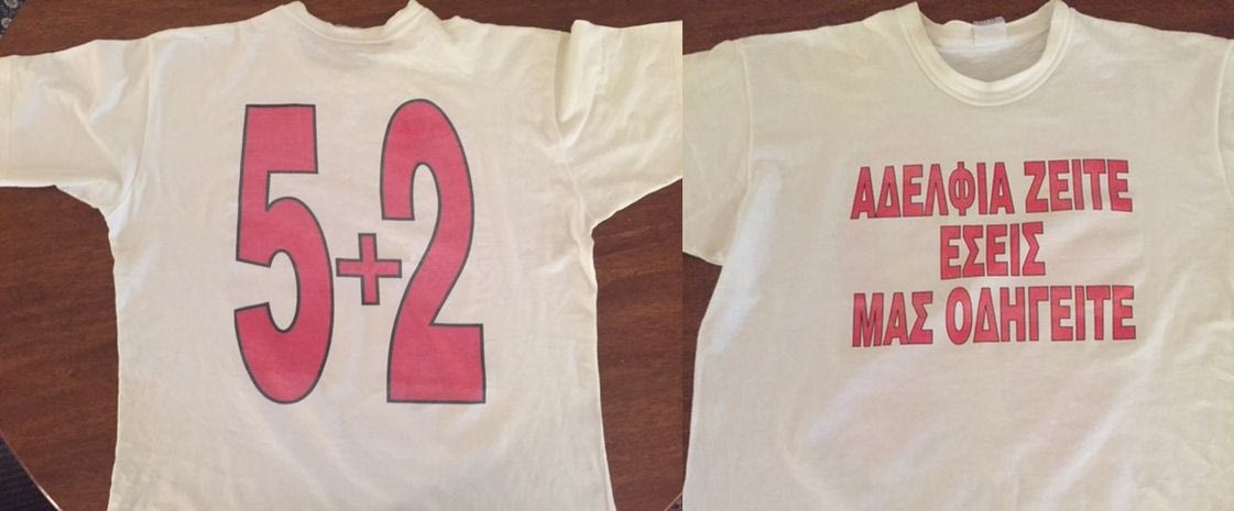 Οι «ερυθρόλευκοι», μάλιστα, έχουν τυπώσει και μπλουζάκια, για να τα φορέσουν την ώρα της στέψης. Είναι λευκά, στην μπροστινή πλευρά γράφουν με κόκκινα γράμματα « αδέρφια ζείτε εσείς μας οδηγείτε» ως αφιέρωμα στη μνήμη των αδικοχαμένων φίλων της θύρας 7 και στην πίσω « 5+2», τα πρωταθλήματα δηλαδή και τα Κύπελλα στο διάστημα της 5ετίας.