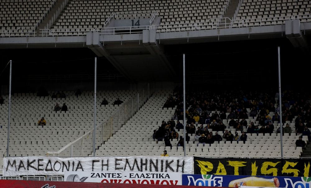 Στο σημείο εκείνο ήταν ένα πανό των φίλων της Ένωσης που έγραφε: “Μακεδονία γη ελληνική”.