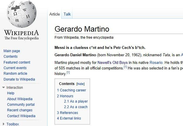 Λίγες στιγμές μετά από την κυκλοφορία της είδησης ότι ο Χεράρδο Μαρτίνο θα αποτελέσει τον νέο τεχνικό της Μπαρτσελόνα, ένας φίλος της Τσέλσι ξέσπασε στο προφίλ του Αργεντινού τεχνικού στη Wikipedia.