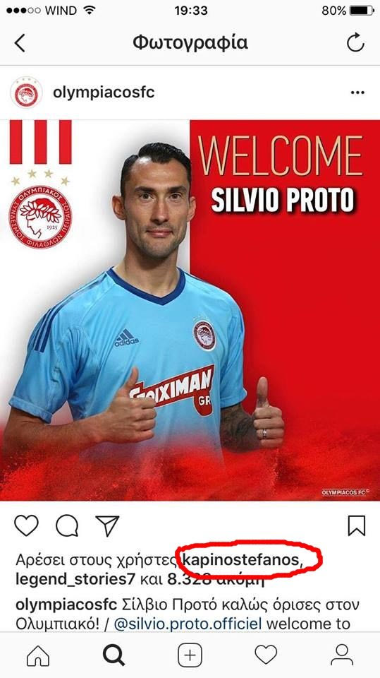 O Σίλβιο Προτό είναι και με τη βούλα ποδοσφαιριστής του Ολυμπιακού με τον Στέφανο Καπίνο να γίνεται από τους πρώτους που έκαναν... like στην ανακοίνωση των ερυθρολεύκων!