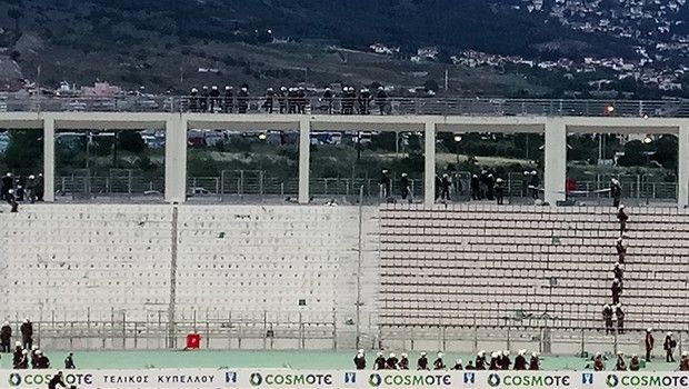 Για ν’ αποφευχθεί όλο αυτό το σκηνικό τρόμου θ’ αρκούσε μια μικρή ομάδα 15-20 ανδρών, όπως βλέπετε και στη σχετική φωτογραφία (η λήψη της έγινε μετά την επέμβαση των δυνάμεων ασφαλείας). Ακόμη κι ένας ηλίθιος θα μπορούσε να το έχει προβλέψει. Στο Πανθεσσαλικό, όπως αποδείχτηκε, είχαμε περίσσευμα από “φωστήρες”.