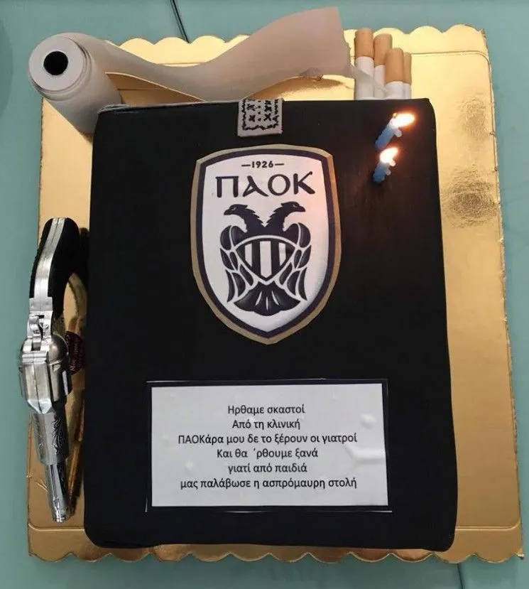 Η τούρτα είχε σχήμα πακέτου τσιγάρων μάρκας… ΠΑΟΚ, και τη θέση του αντικαπνιστικού μηνύματος πήρε ένας από τα συνθήματα της ασπρόμαυρης κερκίδας. Το «κλου» όμως δεν είναι εκεί, αλλά στο… γαρνίρισμα της τούρτας.