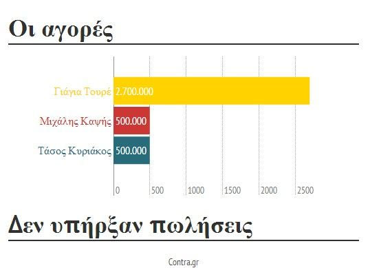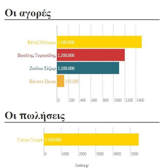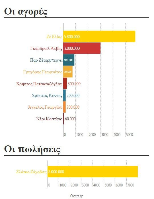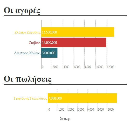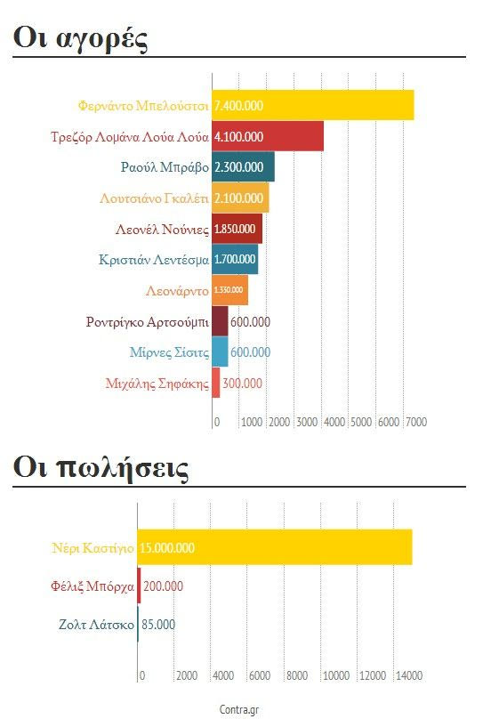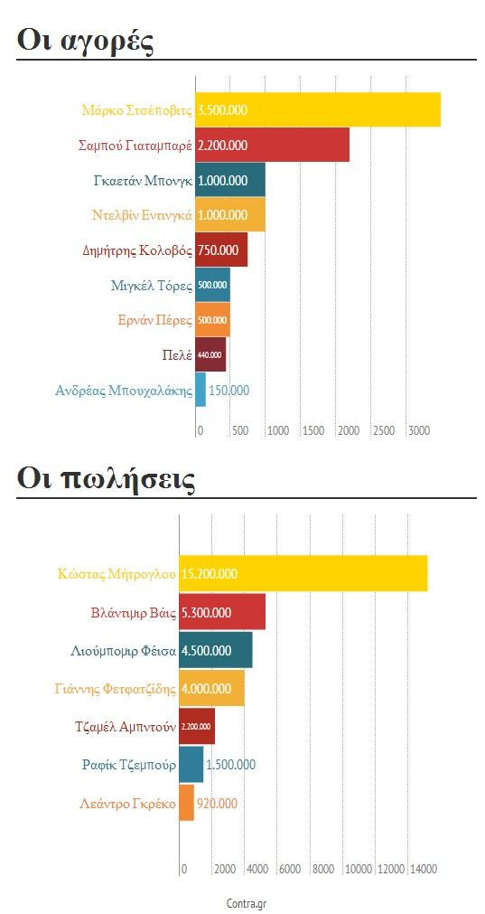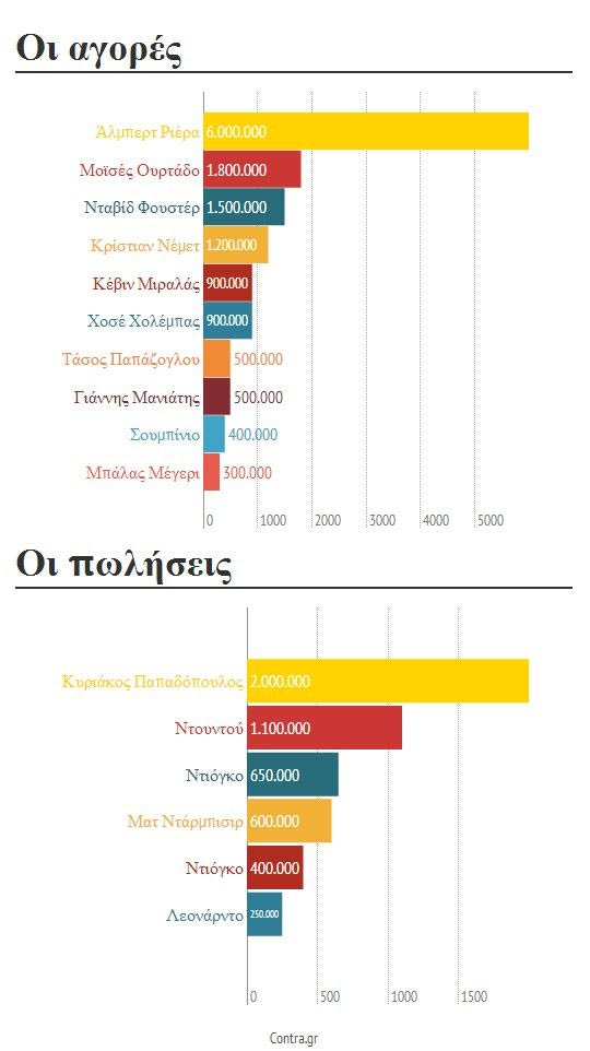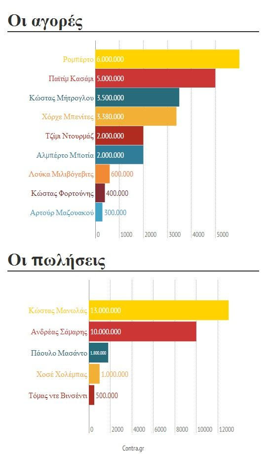 * Στην εποχή Βαγγέλη Μαρινάκη, οι αγορές ανέρχονται σε 64.570.000 ευρώ, οι παραχωρήσεις σε 77.520.000 ευρώ και συνολικά η ΠΑΕ έχει εισπράξει από αυτές τις κινήσεις 12.940.000 ευρώ